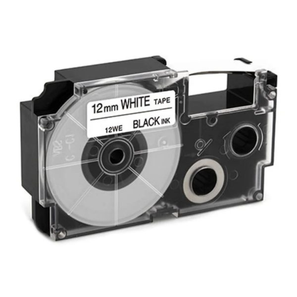 Cinta Casio XR-12WE, PT-12WE (12mmx8m), Compatible. Resistente al agua, resistente a los productos químicos, resistente a altas y bajas temperaturas, resistente a la abrasión, resistente a la grasa y resistente a la decoloración. Perfecto para uso en interiores y exteriores.
