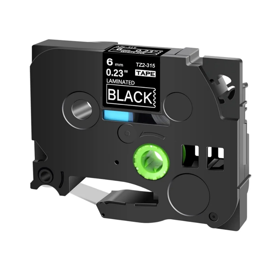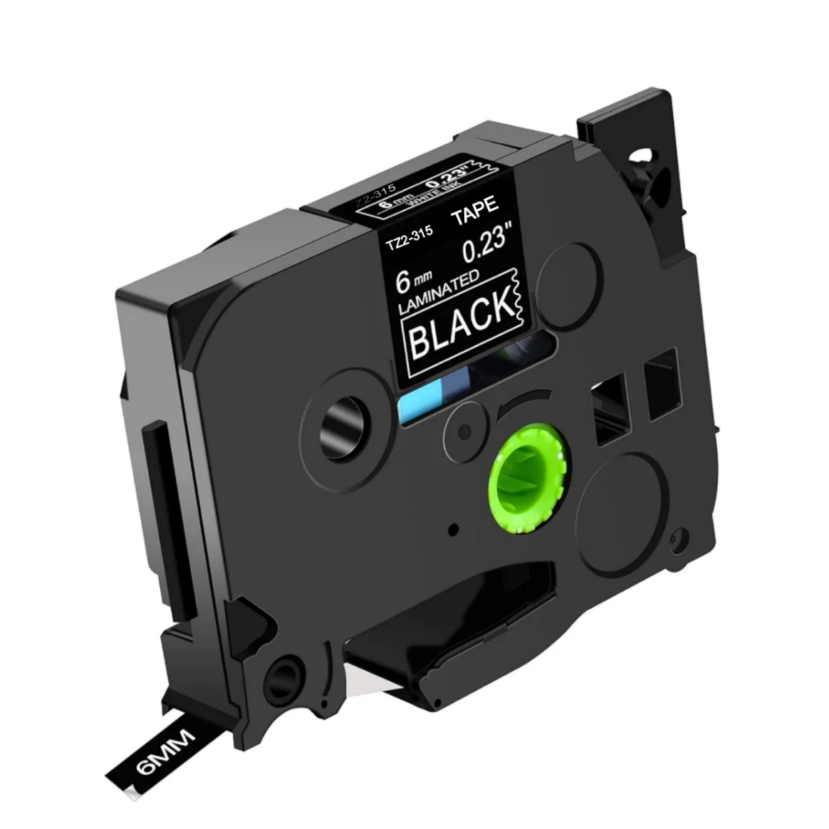Cinta Brother Tze-315,Tz2-315 (6mm x 8mts.) letra blanca sobre fondo negro Compatible, Utilizable en las rotuladoras electrónicas que muestran el logotipo TZ y TZe. Utilizadas para un etiquetado general en superficies lisas y planas, crean etiquetas claramente legibles por mucho tiempo.