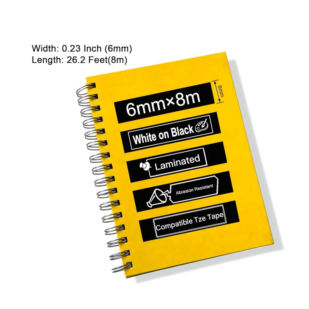 Cintas de etiquetas compatibles con Tze-315,Tz2-315 (6mm x 8mts) Letra blanco sobre Negro, están diseñadas para durar, incluso bajo condiciones extremas y son capaces de aguantar temperaturas extremas, luz solar, agua, sustancias químicas o la abrasión.