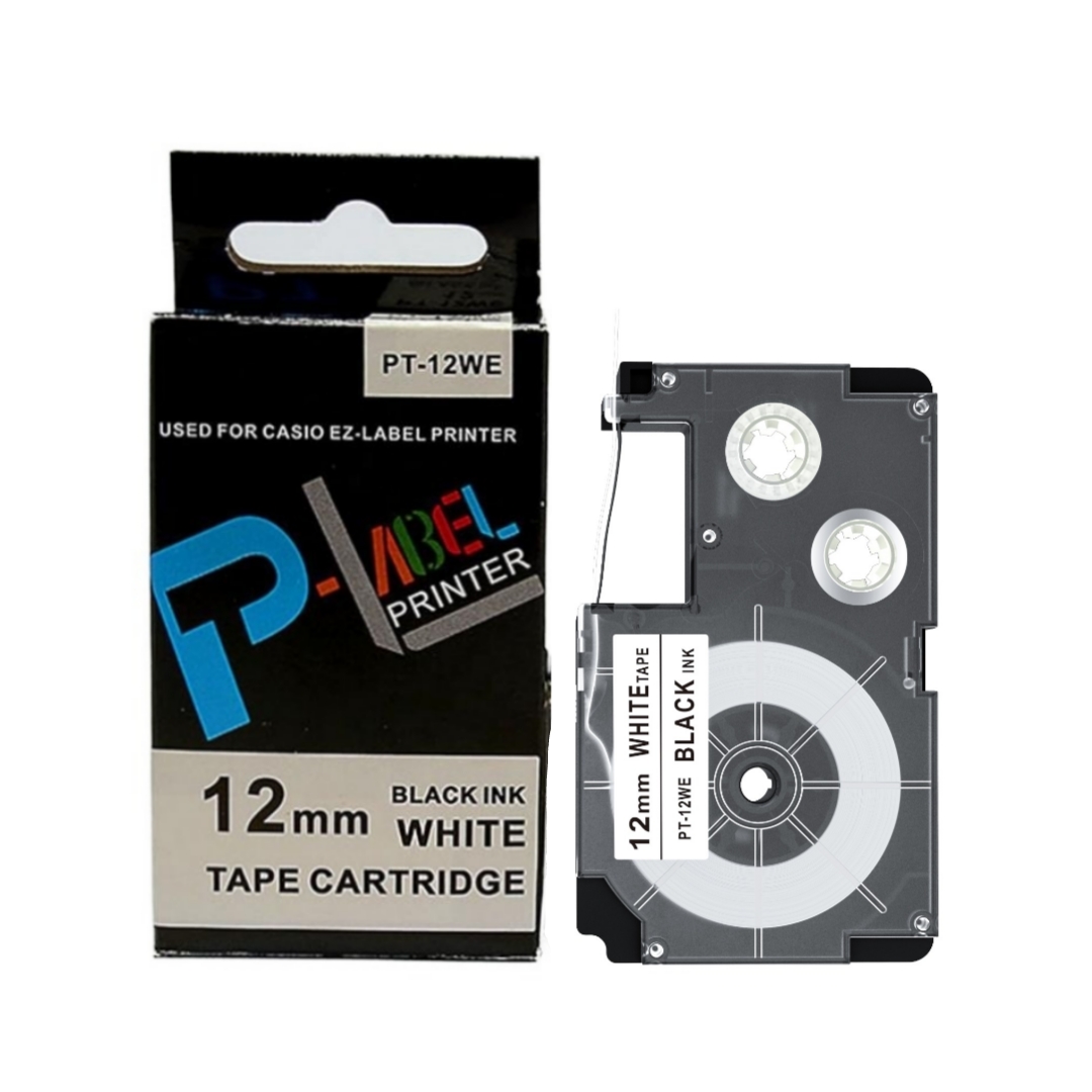 Cinta Casio XR-12WE, PT-12WE (12mmx8m), Compatible. Resistente al agua, resistente a los productos químicos, resistente a altas y bajas temperaturas, resistente a la abrasión, resistente a la grasa y resistente a la decoloración. Perfecto para uso en interiores y exteriores.